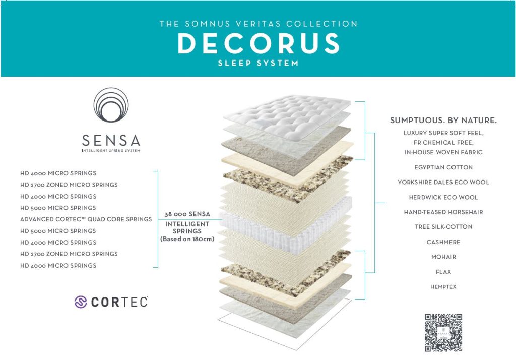 El Decorus 38000 encarna una sofisticada combinación de confort avanzado, artesanía experta y tecnología de soporte de alta precisión dentro de la Colección Somnus Veritas de Harrison Spinks. Un colchón diseñado para quienes buscan una experiencia de descanso equilibrada, envolvente y duradera, con la garantía de los mejores materiales naturales y un sistema de muelles excepcionalmente desarrollado.