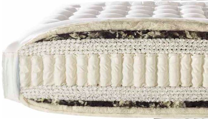 Está elaborado con una cuidada selección de rellenos naturales transpirables, entre los que destacan la lujosa lana británica super delicada, el algodón kapok, y una refinada mezcla de fibras nobles que aportan suavidad, elasticidad y una excelente regulación térmica. A ello se suma el exclusivo soporte de crin de caballo trenzada y preparada a mano, reconocida por su resistencia, flexibilidad y extraordinaria capacidad de recuperación.