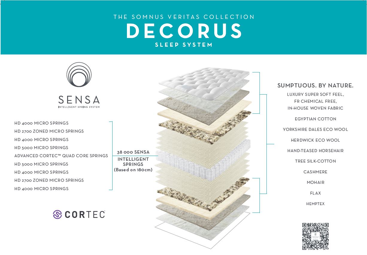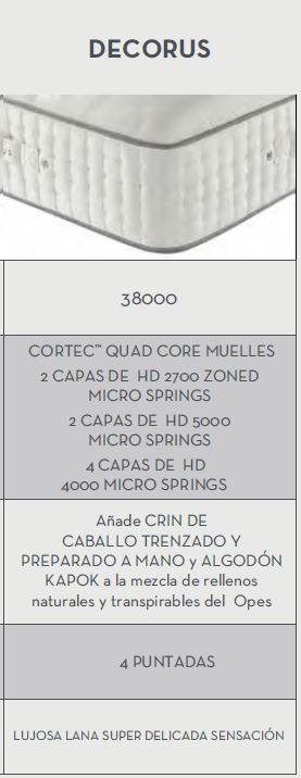 En su núcleo, el Decorus 38000 incorpora el avanzado sistema Cortec™ Quad Core, que aporta una estabilidad central superior y un soporte progresivo y preciso. Este sistema se combina con múltiples capas de HD Micro Springs, cuidadosamente distribuidas para una adaptación milimétrica al cuerpo: