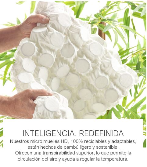 En su núcleo incorpora exclusivos micromuelles HD de bambú, diseñados para ofrecer un soporte sensible y reactivo, adaptándose con precisión a los contornos del cuerpo y aliviando los puntos de presión sin restar suavidad.