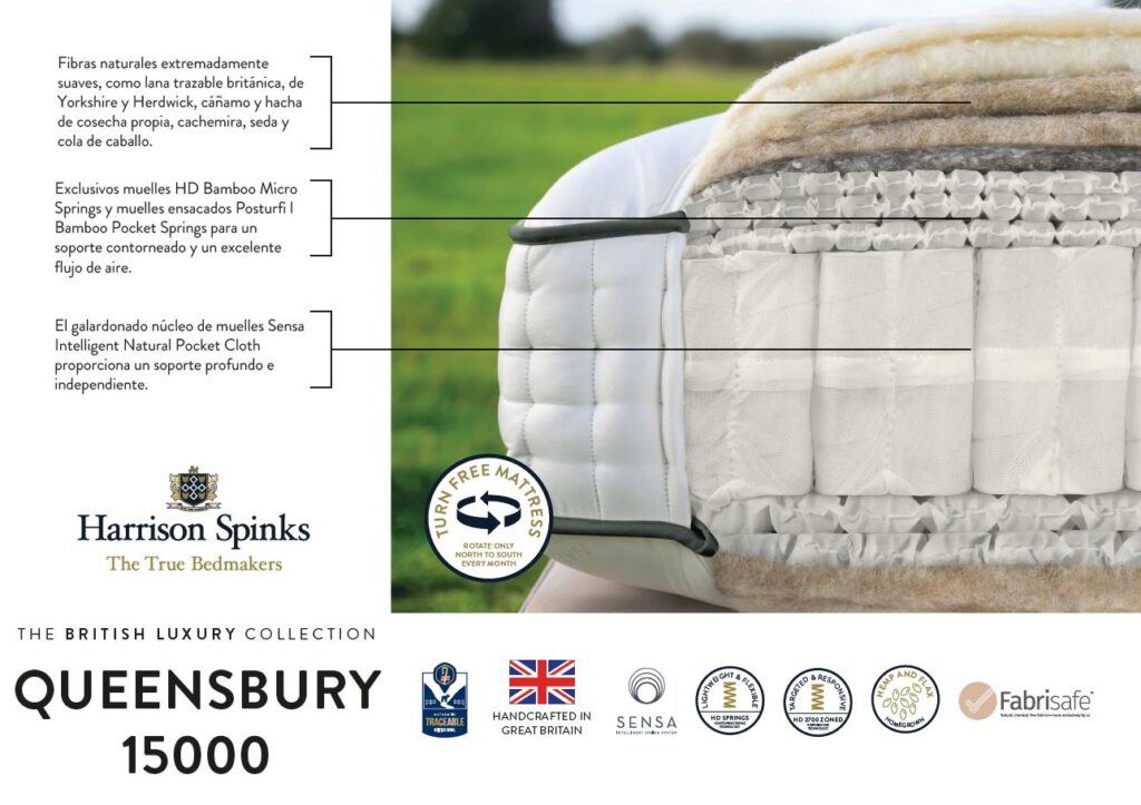 Elaborado artesanalmente con lujosas capas de rellenos naturales, como cachemira, seda, lana Yorkshire, lana Herdwick, cola de caballo, cáñamo y lino de cosecha propia, y lana británica. Cada relleno está cuidadosamente mezclado y se integra armoniosamente con un sistema de 15 000 muelles, con un núcleo de muelles de tela natural ensacados, que ofrece un soporte adaptable y un sueño reparador. Acabado con cuatro filas de meticulosas costuras laterales y un tacto supersuave de primera calidad, tejido propio ignífugo sin tratamiento químico.