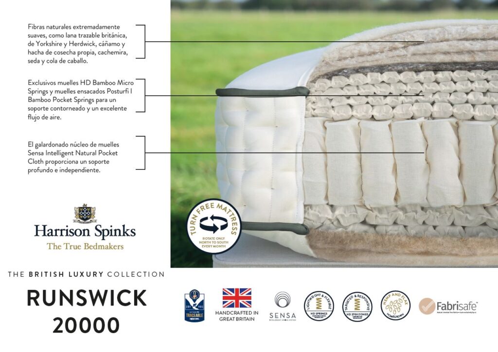 El Runswick, un entorno de descanso superior, está compuesto por un sistema de 20.000 muelles y suntuosos materiales naturales, como seda, cachemira, lana Yorkshire, lana Herdwick, lana británica, cola de caballo, cáñamo y lino de cultivo local. Cada relleno está cuidadosamente mezclado y se integra armoniosamente con nuestro sistema de muelles, con un núcleo de muelles de tela natural ensacada, que ofrece un soporte adaptable y un sueño reparador. Está rematado con seis filas de costuras laterales perfeccionadas y un tejido de primera calidad, supersuave, ignífugo y sin tratamiento químico.