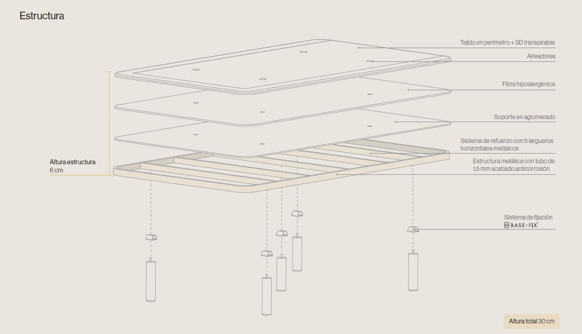Con su tapa 3D, el sistema Base Fix® y su estructura reforzada, garantiza un descanso estable, fresco y duradero, personalizable en múltiples tapizados y patas.