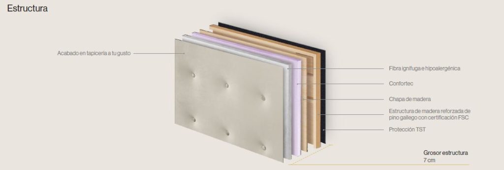 Sobre él, se superponen capas seleccionadas por su confort y seguridad: chapa de madera, Confortec, y una fibra ignífuga e hipoalergénica que garantiza comodidad, higiene y protección. Todo ello queda envuelto en un tapizado que puedes personalizar a tu gusto, convirtiendo la pieza en un elemento decorativo único que habla de tu estilo.