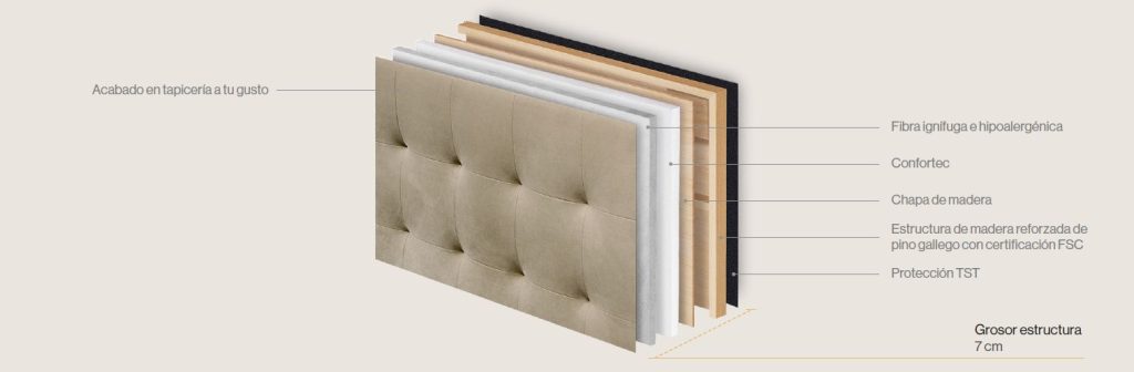 Sobre esta base noble se superponen cuidadosamente capas diseñadas para ofrecer bienestar y seguridad: chapa de madera, Confortec y una fibra ignífuga e hipoalergénica que proporciona higiene, suavidad y protección. Todo ello envuelto en un tapizado personalizable que permite convertir el cabezal en una pieza única, perfectamente adaptada a la estética de tu dormitorio.