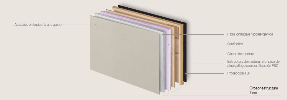 Sobre esta base noble se superponen capas cuidadosamente estudiadas para ofrecer bienestar y protección: chapa de madera, Confortec y una fibra ignífuga e hipoalergénica que aporta suavidad, higiene y un confort absoluto. Todo ello envuelto en un tapizado personalizable, que convierte el cabezal en una pieza única capaz de adaptarse a la estética y la atmósfera de cualquier dormitorio.
