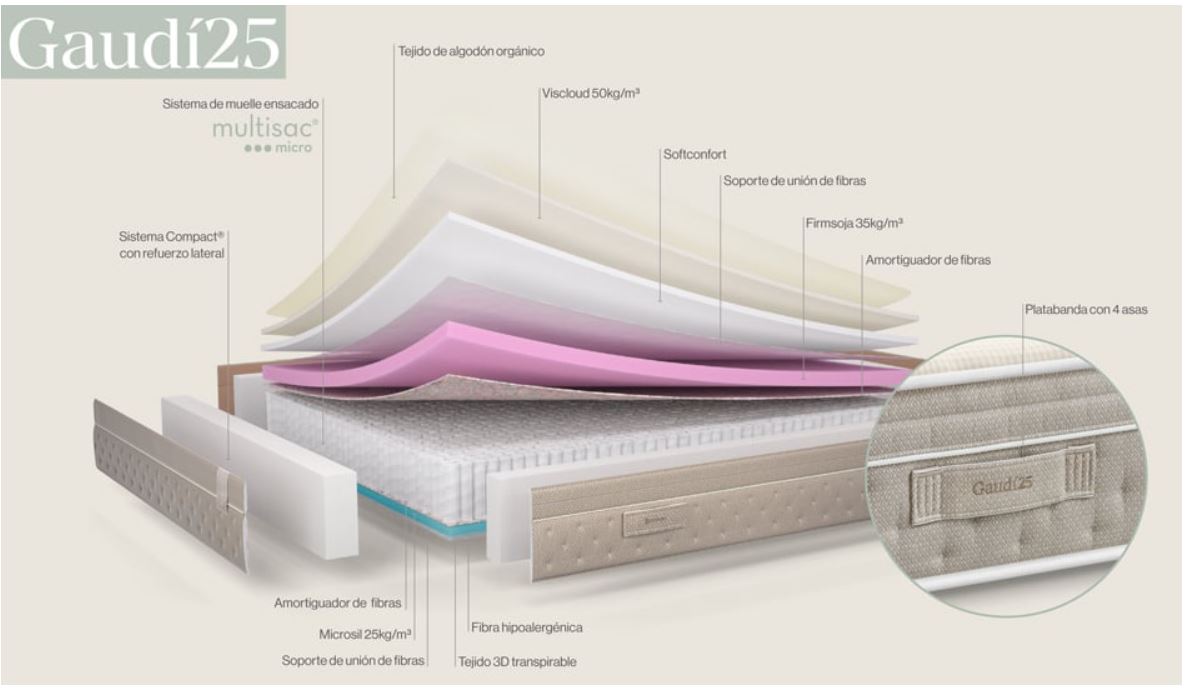 El Sonpura Gaudí 25 está fabricado específicamente para ser compatible con camas y somieres articulados, manteniendo su forma, firmeza y durabilidad incluso con uso diario en posiciones elevadas o inclinadas.