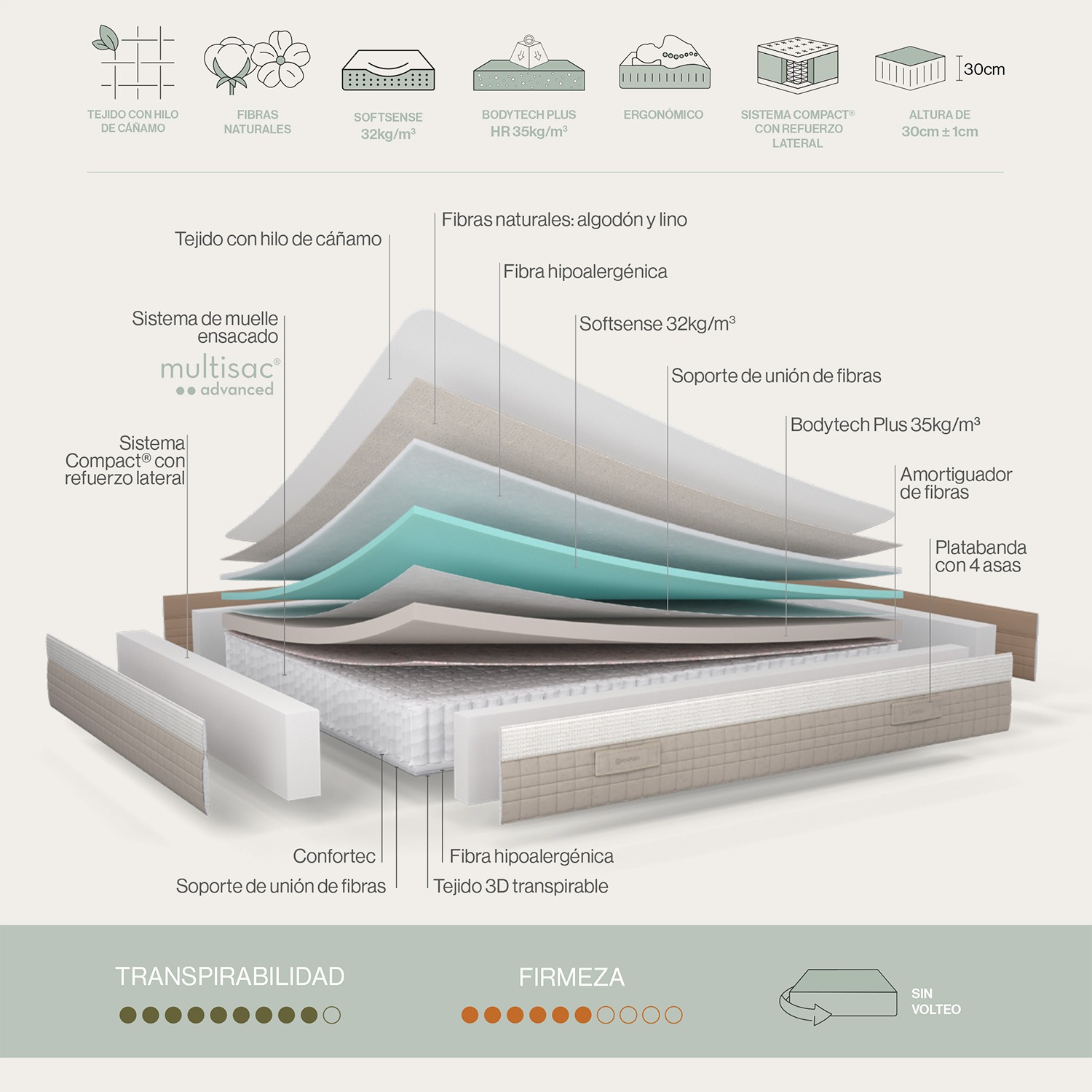 El uso de fibras naturales junto a su núcleo de muelles ensacados favorece una ventilación natural y continua, evitando la acumulación de calor y humedad.